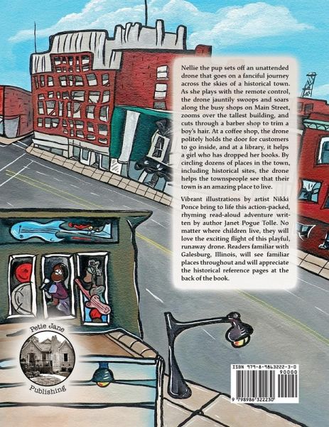 Nellie the pup sets off an unattended drone that goes on a fanciful journey across the skies of a historical town. As she plays with the remote control, the drone jauntily swoops and soars along the busy shops on Main Street, zooms over the tallest building, and cuts through a barber shop to trim a boy's hair. At a coffee shop, the drone politely holds the door for customers to go inside, and at a library, it helps a girl who has dropped her books. By circling dozens of places in the town, including historical sites, the drone helps the townspeople see that their town is an amazing place to live. Vibrant illustrations by artist Nikki Ponce bring to life this action-packed, rhyming read-aloud adventure written by author Janet Pogue Tolle. No matter where children live, they will love the exciting flight of this playful runaway drone. Readers familiar with Galesburg, Illinois, will see familiar places throughout and will appreciate the historical reference pages in the back of the book.