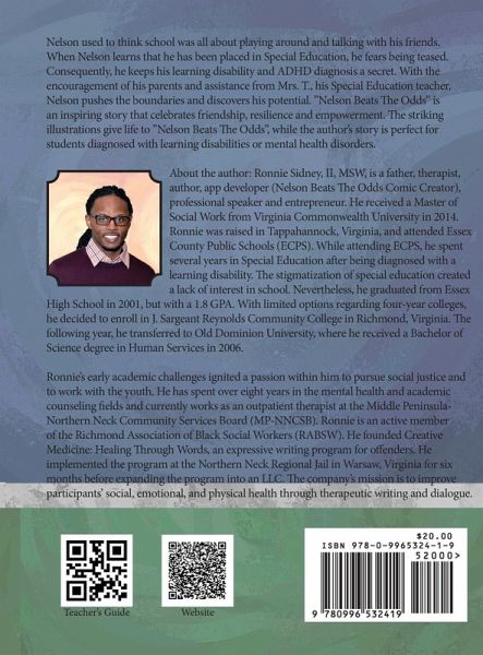 Ronnie Sidney, II, MSW, is a father, therapist, author, app developer, professional speaker and entrepreneur. He received a Master of Social Work from Virginia Commonwealth University in 2014. Ronnie was raised in Tappahannock, Virginia, and attended Essex County Public Schools (ECPS). While attending ECPS, he spent several years in Special Education after being diagnosed with a learning disability. The stigmatization of special education created a lack of interest in school. Nevertheless, he graduated from Essex High School in 2001, but with a 1.8 GPA. With limited options regarding four-year colleges, he decided to enroll in J. Sargeant Reynolds Community College in Richmond, Virginia. The following year, he transferred to Old Dominion University, where he received a Bachelor of Science degree in Human Services in 2006. Ronnie's early academic challenges ignited a passion within him to pursue social justice and to work with the youth. He has spent over eight years in the mental health and academic counseling fields and currently works as an outpatient therapist at the Middle Peninsula-Northern Neck Community Services Board (MP-NNCSB). Ronnie is an active member of the Richmond Association of Black Social Workers (RABSW). He founded Creative Medicine: Healing Through Words, an expressive writing program for offenders. He implemented the program at the Northern Neck Regional Jail in Warsaw, Virginia for six months before expanding the program into an LLC. The company's mission is to improve participants' social, emotional, and physical health through therapeutic writing and dialogue. In 2015, Creative Medicine: Healing Through Words, LLC published "Nelson Beats The Odds", an inspiring graphic novel that celebrates friendship, resilience and empowerment. Nelson, the books' main character, overcomes his learning disability and ADHD diagnosis with the help of his parents and special education teacher. After releasing "Nelson Beats The Odds", Ronnie was inspired to develop the Nelson Beats The Odds Comic Creator app for iOS and Android mobile devices. Ronnie created the app so that children and adults can share inspirational photos and stories about how they beat the odds on social media. For more information visit the author's website at www.creative-medicine.com.