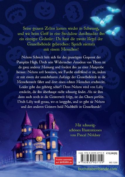 Seine grauen Zellen kamen wieder in Schwung, und wie beim Griff in eine Steckdose durchzuckte ihn ein einziger Gedanke: Du hast die zweite Regel der Gruselbehörde gebrochen: Sprich niemals mit einem Menschen! Nelson Schreck hält sich für das gruseligste Gespenst der Pumpkin High. Doch sein Widersacher Amadeus van Thom ist da ganz anderer Meinung und fordert Nelson zu einer Mutprobe heraus: Nelson soll beweisen, wie Furcht einflößend er ist, indem er mit einem der unsichtbaren Aufzüge der Gruselbehörde in die Menschenwelt fährt und dort einen echten Menschen erschreckt. Leider geht das gehörig schief! Denn Nelson wird von Lilly entdeckt, die ihn überhaupt nicht schaurig findet. Als sie ihm dann auch noch in die Geisterwelt folgt, ist das Chaos perfekt. Doch Lilly weiß genau, wo es langgeht, und so gibt sie Nelson und den anderen Geistern bald Nachhilfe in Gruselkunde!Mit schaurig-schönen Illustrationen von Pascal NöldnerDieser Titel ist bei Antolin gelistet.