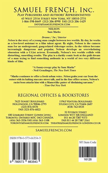 3 m / Drama / Interior Nelson is the story of a young man caught between two worlds. By day, he works as a low-level assistant to a film talent agent. By night, Nelson is the camera man for an underground, gang-related videotape series. As the videos become increasingly dangerous and popular, Nelson develops an overwhelming obsession with a C-List actress. Eventually, Nelson's two worlds collide with disturbing, unsettling results. The play is a darkly comic look at the guilt dream of a man trying to find something authentic in a world of two very different kinds of film. "A funny-creepy play by Sam Marks" - Neil Genzlinger, The New York Times "Marks continues to offer a fresh urban voice. Nelson grabs your ear from the outset with its halting staccato street talk, and in the fine office scenes, Nelson's racist boss attacks him with a Mamet-like patter of disdaining sarcasm." - Time Out New York