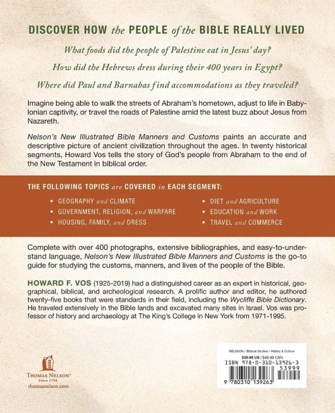 Discover how the people of the Bible really lived. Imagine being able to walk the streets of Abraham's hometown, adjust to life in Babylonian captivity, or travel the roads of Palestine amid the latest buzz about Jesus from Nazareth. Nelson's New Illustrated Bible Manners & Customs paints an accurate and descriptive picture of ancient civilization throughout the ages. In twenty historical segments, Howard F. Vos tells the story of God's people from Abraham to the end of the New Testament in biblical order. Unlike other books about Bible lands and cultures, this volume distinguishes the ways life differed from period to period and place to place. The following topics are covered in each segment: Geography and climate Government, religion, and warfare Housing, family, and dress Diet and agriculture Education and work Travel and commerce Complete with over 400 photographs, extensive bibliographies, and easy-to-understand language, Nelson's New Illustrated Bible Manners & Customs is the go-to guide for studying the customs, manners, and lives of the people of the Bible. Please note: this volume is printed in black and white.