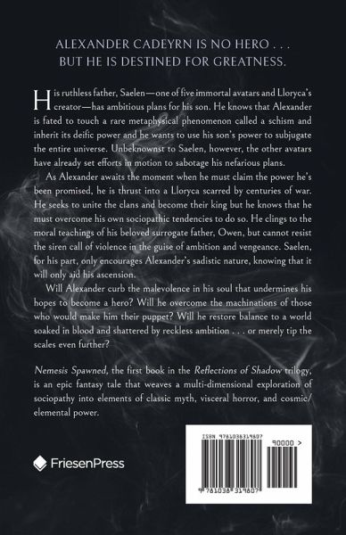 Alexander Cadeyrn is no hero . . . but he is destined for greatness. His ruthless father, Saelen-one of five immortal avatars and Lloryca's creator-has ambitious plans for his son. He knows that Alexander is fated to touch a rare metaphysical phenomenon called a schism and inherit its deific power and he wants to use his son's power to subjugate the entire universe. Unbeknownst to Saelen, however, the other avatars have already set efforts in motion to sabotage his nefarious plans. As Alexander awaits the moment when he must claim the power he's been promised, he is thrust into a Lloryca scarred by centuries of war. He seeks to unite the clans and become their king but he knows that he must overcome his own sociopathic tendencies to do so. He clings to the moral teachings of his beloved surrogate father, Owen, but cannot resist the siren call of violence in the guise of ambition and vengeance. Saelen, for his part, only encourages Alexander's sadistic nature, knowing that it will only aid his ascension. Will Alexander curb the malevolence in his soul that undermines his hopes to become a hero? Will he overcome the machinations of those who would make him their puppet? Will he restore balance to a world soaked in blood and shattered by reckless ambition . . . or merely tip the scales even further? Nemesis Spawned, the first book in the Reflections of Shadow trilogy, is an epic fantasy tale that weaves a multi-dimensional exploration of sociopathy into elements of classic myth, visceral horror, and cosmic/elemental power.