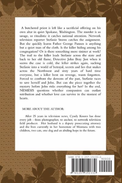 A butchered priest is left like a sacrificial offering on his own altar in quiet Spokane, Washington. The murder is so savage, so ritualistic it catches national attention. Network television reporter Stefanie Storm catches the assignment. But she quickly learns Father George Pannos is anything but a quiet man of the cloth. Just when it seems the case is cold, the killer strikes again, sucking Stefanie into a world of betrayal, secrets and lies that snakes across the Northwest and sixty years of hard time everyone, but a killer bent on revenge, wants forgotten. In the end, NEMESIS questions whether compassion can outlast retribution and whether love can survive in the stoniest of hearts.