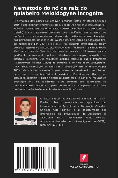 O nemátodo das galhas Meloidogyne incognita (Kofoid et White) Chitwood 1949 é um importante nemátodo do quiabeiro (Abelmoschus esculentus (L.) Moench.). Conclui-se que o nematicida químico carbosulfan 25 SD (controlo tratado) é um tratamento promissor que manifestou um aumento dos parâmetros de crescimento das plantas, do rendimento e uma diminuição das galhas/planta, da massa de ovos/planta, bem como da população final de nemátodos por 200 cc de solo. Na presente investigação, foram utilizados agentes de biocontrolo: Pseudomonas fluorescens e Paecilomyces lilacinus e bolos de óleo: bolo de neem e bolo de pinhão-manso para a gestão do nemátodo das galhas radiculares, Meloidogyne incognita, que infecta o quiabeiro. Dos resultados obtidos conclui-se que o tratamento (Paecilomyces lilacinus 10g/kg de semente + bolo de neem 100g/pot) foi muito eficaz na redução das galhas e da população final de nemátodos por 200 cc de solo, aumentando os parâmetros de crescimento das plantas, bem como o peso dos frutos do quiabeiro. (Pseudomonas fluorescens 10g/kg de semente + bolo de neem 100g/pot) foi o seguinte na redução da população final de nemátodos e no aumento dos parâmetros de crescimento das plantas e do peso dos frutos. Os bio-agentes ou os bolos de óleo utilizados isoladamente não foram muito eficazes.
