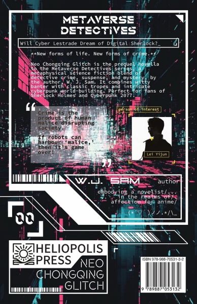 New forms of life. New forms of crime. In the famous cyberpunk city of Chongqing, 2042, young police officer Lei Yijun faces a daunting challenge as he re-investigates a suspenseful accident that occurred six years ago. A peculiar journalist seems to know too much about the details of the case, and the novel he wrote raises Lei's suspicions. As the young leader of the Special Tech-crimes Action Team, Lei must seek the truth through these uncertain narratives from a novel angle. Mysteries in narratives will never die, even in the new era, where humans live in a metaverse with advanced technologies in computer science and robotic automation. Will Officer Lei be able to combat the neo-criminal minds? Neo Chongqing Glitch is the prequel novella to the Metaverse Detectives series, a metaphysical science fiction blend of detective crime, suspense, and mystery, by the author, W. J. Sam. It combines witty banter with classic tropes and intricate cyberpunk world-building. Perfect for fans of Sherlock Holmes and Cyberpunk 2077. Dive into the enigmatic world of Neo Chongqing Glitch today and unravel the mysteries of the metaverse. Grab your copy now and join Lei Yijun on his thrilling quest for truth!
