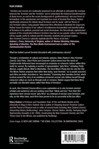 Through a combination of cultural and industry analysis, Hilary Radner's Neo-Feminist Cinema: Girly Films, Chick Flicks and Consumer Culture shows how the needs of conglomerate Hollywood have encouraged an emphasis on consumer culture within films made for women. By exploring a number of representative "girly films," including Pretty Woman, Legally Blonde, Maid in Manhattan, The Devil Wears Prada, and Sex and the City: The Movie, Radner proposes that rather than being "post-feminist," as is usually assumed, such films are better described as "neo-feminist." Examining their narrative format, as it revolves around the story of an ambitious unmarried woman who defines herself through consumer culture as much as through work or romance, Radner argues that these films exemplify neo-liberalist values rather than those of feminism.