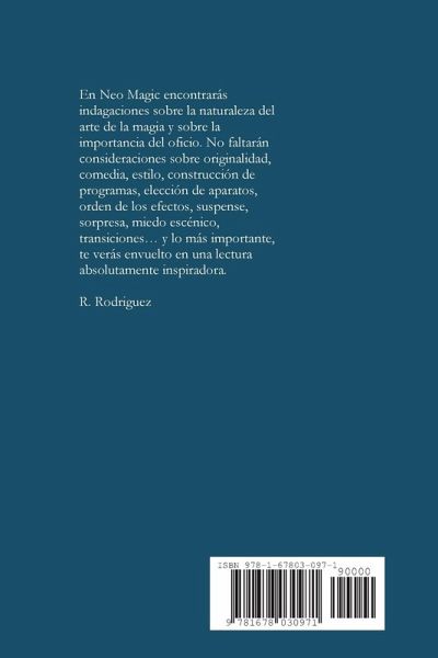En Neo Magic encontrarás indagaciones sobre la naturaleza del arte de la magia y sobre la importancia del oficio. No faltarán consideraciones sobre originalidad, comedia, estilo, construcción de programas, elección de aparatos, orden de los efectos, suspense, sorpresa, miedo escénico, transiciones... y lo más importante, te verás envuelto en una lectura absolutamente inspiradora. R. Rodriguez