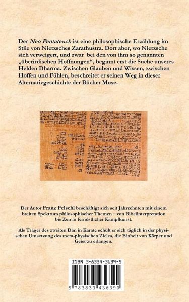 Der Neo Pentateuch ist eine philosophische Erzählung im Stile von Nietzsches Zarathustra. Dort aber, wo Nietzsche sich verweigert, und zwar bei den von ihm so genannten "überirdischen Hoffnungen", beginnt erst die Suche unseres Helden Dharma. Zwischen Glauben und Wissen, zwischen Hoffen und Fühlen, beschreitet er seinen Weg in dieser Alternativgeschichte der Bücher Mose.