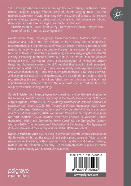 1. Introduction: Stuff and Things: Introducing Neo-Victorian Materialities.- 2. Objects and Memorabilia in Deborah Lutz's The Brontë Cabinet: Three Lives in Nine Objects.- 3. "Around the Mizzenpole": Charles Johnson's Middle Passage and African Americanizing the Neo-Victorian-at-sea.- 4. Touching, Writing, Collecting: Opium Paraphernalia and Neo-Victorian Material Culture.- 5. An Instrumental Thing: Pianos Extending and Becoming Postcolonial Bodies in Jane Campion's The Piano and Daniel Mason's The Piano Tuner.- 6. "Wilful Phantoms": Haunted Dress, Memory, and Agentic Materiality in Colm Tóibín's The Master.- 7. The Thing About Haunted Houses: In The Turn of the Screw, The Innocents and The Haunting of Hill House.- 8. There's Something in the Tea: Murder and Materiality in Dark Angel.- 9. Criminal Things: Sherlock Holmes' Details of Detection and Their Neo-Victorian Revisions.- 10. The Sleight of Hand: Appearance and Disappearance of Things in Neo-Victorian Magic.