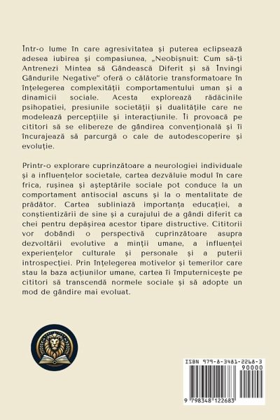 Într-o lume în care agresivitatea ¿i puterea eclipseaz¿ adesea iubirea ¿i compasiunea, "Neobi¿nuit: Cum s¿-¿i Antrenezi Mintea s¿ Gândeasc¿ Diferit ¿i s¿ Învingi Gândurile Negative" ofer¿ o c¿l¿torie transformatoare în în¿elegerea complexit¿¿ii comportamentului uman ¿i a dinamicii sociale. Acesta exploreaz¿ r¿d¿cinile psihopatiei, presiunile societ¿¿ii ¿i dualit¿¿ile care ne modeleaz¿ percep¿iile ¿i interac¿iunile. Îi provoac¿ pe cititori s¿ se elibereze de gândirea conven¿ional¿ ¿i îi încurajeaz¿ s¿ parcurg¿ o cale de autodescoperire ¿i evolüie. Printr-o explorare cuprinz¿toare a neurologiei individuale ¿i a influen¿elor societale, cartea dezv¿luie modul în care frica, rüinea ¿i ätept¿rile sociale pot conduce la un comportament antisocial ascuns ¿i la o mentalitate de pr¿d¿tor. Cartea subliniaz¿ importan¿a educäiei, a con¿tientiz¿rii de sine ¿i a curajului de a gândi diferit ca chei pentru dep¿¿irea acestor tipare distructive. Cititorii vor dobândi o perspectiv¿ cuprinz¿toare asupra dezvolt¿rii evolutive a min¿ii umane, a influen¿ei experien¿elor culturale ¿i personale ¿i a puterii introspec¿iei. Prin în¿elegerea motivelor ¿i temerilor care stau la baza ac¿iunilor umane, cartea îi împuternice¿te pe cititori s¿ transcend¿ normele sociale ¿i s¿ adopte un mod de gândire mai evoluat. Mai mult decât un ghid de dezvoltare personal¿, "Neobi¿nuit" este o chemare la ac¿iune pentru schimbare social¿, îndemnând cititorii s¿ contribuie la o lume în care cooperarea ¿i empatia prevaleaz¿ asupra diviziunii ¿i competi¿iei. Fie c¿ este vorba de a în¿elege complexitatea psihologiei umane sau de a-¿i transforma propria viä¿, aceast¿ carte ofer¿ instrumentele ¿i perspectivele necesare pentru a prospera într-o lume complex¿.