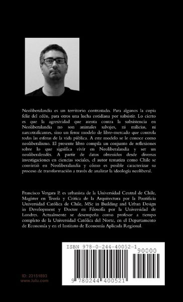 Neoliberalandia es un territorio contrastado. Para algunos la copia feliz del edén, para otros una lucha cotidiana por subsistir. Lo cierto es que la agresividad que atenta contra la subsistencia en Neoliberalandia no son animales salvajes, ni milicias, ni narcotraficantes, sino un feroz modelo de libre-mercado que controla todas las esferas de la vida pública. A este modelo se le conoce como neoliberalismo. El presente libro compila un conjunto de reflexiones sobre lo que significa vivir en Neoliberalandia y ser un neoliberalendés. A partir de datos obtenidos desde diversas investigaciones en ciencias sociales, el autor tematiza como Chile se convirtió en Neoliberalandia y cómo es posible caracterizar su proceso de transformación a través de analizar la ideología neoliberal. Dr Francisco Vergara Perucich profesor a tiempo completo del Departamento de Economía de la Universidad Católica del Norte.