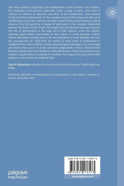 This book examines subjectivity and neoliberalism in Latin America. The chapters, first published in the journal Subjectivity, cover a range of topics, from work to childcare to violence to university education In the Introduction, Julian Medina Zarate and Flavia Uchoa point out the complex history of the arrival and take-up of neoliberalism across the continent, the deep-seated role of colonial and post-colonial violence, thus the specificity of modes of governance in the complex relationship between the North and the South. The chapter by Antar Martinez Guzman considers the role of neoliberalism in the huge rise in male violence across the country, exploring hyper-violent masculinities in the context of social precarity. Antonio Stecher and Alvaro Soto Roy discuss the transformations in work identities and thus the consequences for subjectivity for workers in three kinds of employment in neoliberal Chile. Fabio d'Oliviera studies phsychologists operating in an increasingly precarised service sector in public assistance programmes in Brazil. Hernan Pulido Martinez explores the role of artefacts in the introduction of discourses and practices related to quality within a university in Colombia. Ana Vergara discusses parent-child relations in the context of neoliberal Chile.