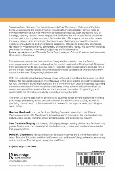 This volume encompasses deeply critical dialogues that question how the field of psychology exists within and is shaped by the current neoliberal political context. Spanning from psychoanalysis to post-colonial theory, these far-reaching discussions consider how a greater ethical responsiveness to human experience and sociopolitical arrangements may reopen the borders of psychological discourse.