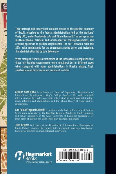 This thorough and timely book collects essays on the political economy of Brazil, focusing on the federal administrations led by the Workers' Party (PT), under Presidents Lula and Dilma Rousseff. The essays examine the economic, political, and social aspects of these governments, and a whole spectrum of policies implemented - or not - between 2003 and 2016, with implications for the subsequent period up to, and including, the administration led by Jair Bolsonaro. What emerges from this examination is the inescapable recognition that those left leaning governments were neoliberal, but in different ways when compared with other administrations in Brazil's history. Their similarities and differences are examined in detail. Contributors are: Adalmir Antonio Marquetti, Alessandro Miebach, Alfredo Saad-Filho, Ana Paula Colombi, Andre Singer, Andreia Galvao, Armando Boito Jr, Barbara Fritz, Cecilia Hoff, Celio Hiratuka, Claudio Castelo Branco Puty, Cristhiane Falchetti, Daniela Magalhaes Prates, Denise Gentil, Eduardo Fagnani, Fabiano Santos, Fabio Luis Barbosa dos Santos, Glaison Augusto Guerrero, Guilherme Mello, Gustavo Codas Friedmann, Humberto Martins, Jose Dari Krein, Lena Lavinas, Lucas Salvador, Andrietta, Luiz Fernando de Paula, Luiz Filgueiras, Marcelo Arend, Patricia Rocha Lemos, Paula Marcelino, Pedro Cezar Dutra Fonseca, Pedro Mendes Loureiro, Pedro Paulo Zuluth Bastos, Pedro Rossi, Rafael Moura, Ruy Braga, and Soraia Aparecida Cardozo.