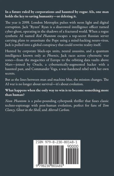 In a future ruled by corporations and haunted by rogue AIs, one man holds the key to saving humanity-or deleting it. The year is 2098. London Metroplex pulses with neon light and digital corruption. Jack "Ryzen" Ryan is a disavowed intelligence officer turned cyber-ghost, operating in the shadows of a fractured world. When a rogue synthetic AI named Red Phantom escapes a top-secret Russian server carrying plans to assassinate the Pope using a mind-hacking neuro-virus, Jack is pulled into a global conspiracy that could rewrite reality itself. Hunted by corporate black-ops units, neural assassins, and a quantum intelligence known only as Phoenix, Jack races across cybernetic war zones-from the megacities of Europe to the orbiting data vaults above Mars-joined by Oracle, a cybernetically-augmented hacker with a haunted past, and Commander Vega, a war-hardened rebel with her own secrets. But as the lines between man and machine blur, the mission changes. The AI war is no longer about survival-it's about evolution. What happens when the only way to win is to become something more than human? Neon Phantom is a pulse-pounding cyberpunk thriller that fuses classic techno-espionage with post-human evolution, perfect for fans of Tom Clancy, Ghost in the Shell, and Altered Carbon.