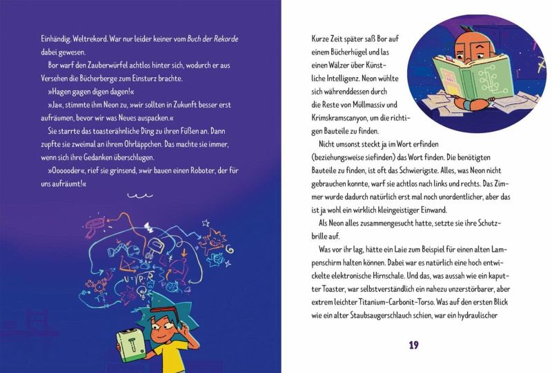 Die Figuren sind bewusst überzeichnet, aber nicht ohne Wiedererkennungswert. Neon ist die klassische „Große“, die alles unter Kontrolle behalten möchte, während Bor mit seiner unbeirrbaren Logik und seiner kindlichen Direktheit für viele der besten Gags sorgt. Dass beide hochbegabt sind, wird nie zum Problem – im Gegenteil: Ihre Intelligenz wird spielerisch und humorvoll inszeniert, nie überheblich. Das macht das Hörbuch auch für Kinder zugänglich, die sich nicht unbedingt mit den Figuren identifizieren, aber viel Spaß an ihren Erfindungen haben.