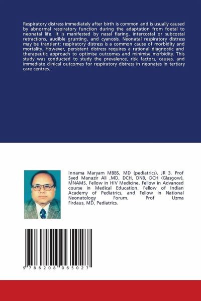 Respiratory distress immediately after birth is common and is usually caused by abnormal respiratory function during the adaptation from foetal to neonatal life. It is manifested by nasal flaring, intercostal or subcostal retractions, audible grunting, and cyanosis. Neonatal respiratory distress may be transient; respiratory distress is a common cause of morbidity and mortality. However, persistent distress requires a rational diagnostic and therapeutic approach to optimise outcomes and minimise morbidity. This study was conducted to study the prevalence, risk factors, causes, and immediate clinical outcomes for respiratory distress in neonates in tertiary care centres.