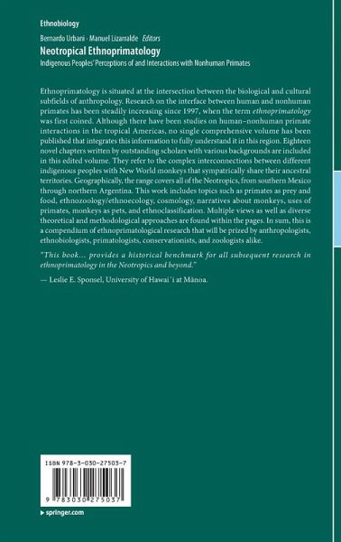 Foreword.- Neotropical Ethnoprimatology: An Introduction.- Part I. Mesoamerica.- 1. Perception and Uses of Primates among Popoluca Indigenous People of Los Tuxtlas, Mexico.- 2. Mental State Attribution to Nonhuman Primates and Other Animals by Rural Inhabitants of the Community of Conhuas near the Calakmul Biosphere Reserve in the Yucatan Peninsula, Mexico.- 3. Local Knowledge and Cultural Significance of Primates (Ateles geoffroyi and Alouatta pigra) among Lacandon Maya from Chiapas, Mexico.- 4. Representation and Signification of Primates in Maya-Q´eqchi´ Cosmovision and Implications for their Conservation in Northwestern Guatemala.- Part II. South America.- 5. Ethnoprimatology of the Tikuna in the Southern Colombian Amazon.- 6. Frugivorous Monkeys Feeding a Tropical Rainforest: Barí Ethnobotanical Ethnoprimatology in Venezuela.- 7. Memories, Monkeys and the Mapoyo People: Rethinking Ethnoprimatology and Eco-Historical Contexts in the Middle Orinoco, Venezuela.- 8. Co-ecology ofJotï, Primates and Other People: A Multi-Species Ethnography in the Venezuelan Guayana.- 9. Primates in the lives of the Yanomami people of Brazil and Venezuela.- 10. Kixiri and the Origin of Day and Night: Ethnoprimatology among the Waimiri Atroari Amerindians of Central Amazonia, Brazil.- 11. Linguistic, Cultural, and Environmental Aspects of Ethnoprimatological Knowledge among the Lokono, Kari'na, and Warao of the Moruca River (Guyana).- 12. Relationships between Scientific Ecology and Knowledge of Primate Ecology of Wapishana Subsistence Hunters in Guyana.- 13. Past, Present and Future of Secoya Ethnoprimatology in the Ecuadorian Amazonia.- 14. The Importance of Nonhuman Primates in Waorani Communities of the Ecuadorian Amazon.- 15. Monkeys in the Wampis (Huambisa) Life and Cosmology in the Peruvian Amazonian Rainforest.- 16. The White Monkey and the Sloth or Pelejo Monkey: Primates in the Social and Cultural Configurations of the Shawi People of Northwestern Peru.- 17. Importanceof Primates to Tacana Indigenous Subsistence Hunting in the Bolivian Amazon.- 18. When Monkeys were Humans: Narratives of the Relationship between Primates and the Toba (Qom) People of the Gran Chaco of Argentina.- Index.