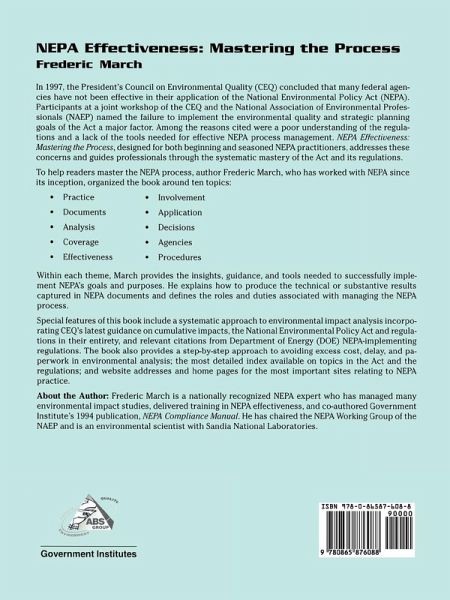 Designed for both beginning and seasoned NEPA practitioners, this book guides professionals through the systematic mastery of the National Environmental Policy Act and its regulations. The book, written by NEPA expert Frederic March, is organized around ten themes of actual practice: purposes, documents, analysis, coverage, effectiveness, involvement, application, decisions, agencies, and procedures.
