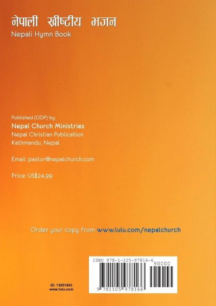 Nepali Christian Hymn Book. This book is originally published in Nepal by bardan publication. This book is useful for Nepali speaking church, house fellowship, and other christian meetings.we are hopefull that the book will be widely used by Nepali speaking people around the globe. The book contains 712 Bhajans, 221 choruses and 70 bal choruses. Book also have ten comandments, The Lord's Prayer and Apostle's creeds and various table of contents.