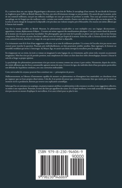Il y a environ deux ans, une équipe d'égyptologues a découvert, non loin de Thèbes, le sarcophage d'une momie. Ils ont décidé de l'envoyer en Angleterre pour l'offrir au British Museum. Dès lors, une série d'événements étranges se sont produits. On aurait dit que la momie, sortie de son sommeil millénaire, exerçait une influence maléfique sur ceux qui avaient osé profaner sa tombe. Tous ceux qui avaient touché au sarcophage ont été frappés par des malheurs variés : certains sont tombés malades, d'autres ont subi des accidents plus ou moins graves. Par la suite, le navire chargé de transporter la dépouille a été pris dans une violente tempête près d'Alexandrie. Des marins ont même affirmé que le bateau était maudit. Une fois la momie installée au British Museum, les phénomènes inexplicables se sont multipliés avec une logique déconcertante : apparitions, visions, déplacements d'objets... Certains ont même rapporté des manifestations physiques. Ceux qui avaient douté du pouvoir de la momie ont été punis pour leur incrédulité. Des photographes qui ont tenté de la prendre en photo ont vu leur santé ou leur fortune compromise. Pire encore, un jeune chercheur a affirmé avoir été visité par l'esprit de la momie. Selon lui, celle-ci, furieuse d'avoir été arrachée à son sommeil éternel, cherchait à se venger de ceux qui avaient profané sa dépouille. Ces événements sont-ils le fruit d'une suggestion collective, ou se sont-ils réellement produits¿? La science de l'occulte n'est pas encore assez avancée pour trancher la question. Pourtant, pris individuellement, ces faits pourraient sembler anodins. Mais regroupés, ils forment un ensemble troublant qui invite à s'interroger. Au Moyen Âge, on aurait sans doute invoqué la sorcellerie pour les expliquer. En m'appuyant sur ces récits, j'ai écrit ce roman en imaginant la suite logique de ces événements, qu'ils soient réels, ressentis ou purement imaginaires. Mon but n'est pas de prendre position, mais simplement de relater ces faits dans leur ordre chronologique, laissant à chacun le soin de se forger sa propre opinion. La psychologie des phénomènes paranormaux n'est pas encore reconnue comme une science à part entière. Néanmoins, depuis des siècles, des initiés affirment que des forces surnaturelles agissent autour de nous. À travers les âges, des individus dotés d'une perception particulière ont défendu des hypothèses similaires, avec une conviction inébranlable. Cette universalité de croyance pourrait bien constituer une - présomption de preuve. Malheureusement, en l'absence d'instruments capables de mesurer ces phénomènes ou d'enregistrer leur matérialité, ces chercheurs n'ont pu s'appuyer que sur leurs propres observations. Cela dit, il est permis de penser que certains événements, bien que rejetés par la raison au moment où ils se produisent, finiront par trouver une explication scientifique. Selon que l'on est convaincu ou sceptique, on pourra toujours attribuer ces phénomènes à des croyances occultes, à une suggestion collective, ou même à une supercherie. Pourtant, il existe des faits qui appellent des causes. Et si l'esprit moderne, à son stade actuel de développement, n'est pas encore en mesure d'expliquer le merveilleux, il est assez éclairé pour ne plus le nier.