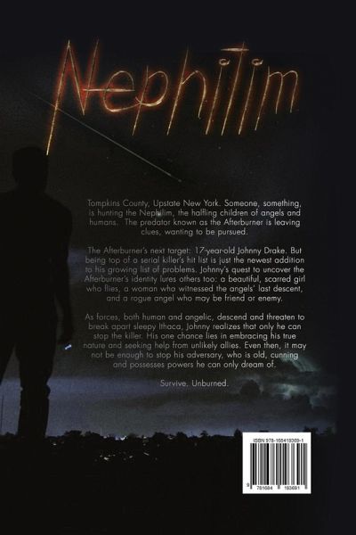 Tompkins County, Upstate New York. Someone, something, is hunting the Nephilim, the halfling children of angels and humans. The predator known as the Afterburner is leaving clues, wanting to be pursued. The Afterburner's next target: 17-year-old Johnny Drake. But being top of a serial killer's hit list is just the newest addition to his growing list of problems. Johnny's quest to uncover the Afterburner's identity lures others too: a beautiful, scarred girl who flies, a woman who witnessed the angels' last descent, and a rogue angel who may be friend or enemy. As forces, both human and angelic, descend and threaten to break apart sleepy Ithaca, Johnny realizes that only he can stop the killer. His one chance lies in embracing his true nature and seeking help from unlikely allies. Even then, it may not be enough to stop his adversary, who is old, cunning and possesses powers he can only dream of. Survive. Unburned. NEPHILIM is a fast-paced, coming of age urban fantasy novel that follows Johnny's thrilling and dangerous journey as he learns his true nature and uses his new found power to stop a cunning, ethereal predator. Steeped in verisimilitude, NEPHILIM takes readers through the exotic plains of Cambodia, where an ancient myth has been brought to life, to the majestic mountains and splendid lakes of Upstate New York, where the echoes of a strange biblical legend reverberate in the lives of all-too real characters.