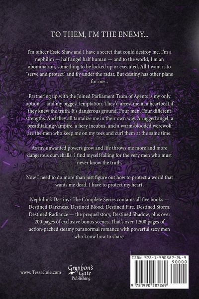 To them, I'm the enemy... I'm officer Essie Shaw and I have a secret that could destroy me. I'm a nephilim - half angel half human - and to the world, I'm an abomination, something to be locked up or executed. All I want is to "serve and protect" and fly under the radar. But destiny has other plans for me... Partnering up with the Joined Parliament Team of Agents is my only option - and my biggest temptation. They'd arrest me in a heartbeat if they knew the truth. It's dangerous ground. Four men. Four different strengths. And they all tantalize me in their own way. A rugged angel, a breathtaking vampire, a fiery incubus, and a warm-blooded werewolf are the men who keep me on my toes and curl them at the same time. As my unwanted powers grow and life throws me more and more dangerous curveballs, I find myself falling for the very men who must never know the truth. Now I need to do more than just figure out how to protect a world that wants me dead. I have to protect my heart. Nephilim's Destiny: The Complete Series contains all five books - Destined Darkness, Destined Blood, Destined Fire, Destined Storm, Destined Radiance - the prequel story, Destined Shadow, plus over 200 pages of exclusive bonus scenes. That's over 1,500 pages of action-packed steamy paranormal romance with powerful sexy men who know how to share.