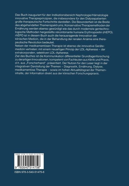 Intention der neuen Reihe Innovative Aspekte der klinischen Medizin ist die - Diskussion innovativer Entwicklungen in der klinischen Medizin - ganzheitliche Betrachtung von Wissenschaftsthemen - von Diagnostik bis Therapie, von Prävention bis Patientenführung, von Verlaufskontrolle bis Nachsorge - Zusammenführung von Wissenschaftstheorie und Praxiserfahrungen. Die Reihe stellt ein Forum für aktuellste Forschungsergebnisse aus der klinischen Forschung dar. Als erster Band erscheint: Das Buch inauguriert für den Indikationsbereich Nephrologie/Hämatologie innovative Therapieprinzipien, die insbesondere für den Dialysepatienten große therapeutische Fortschritte darstellen. Die Besonderheit ist die Breite des abgehandelten Themenspektrums. Konservative Therapiemethoden der Ernährung werden ebenso gewürdigt wie das durch modernste gentechnologische Methoden hergestellte rekombinante humane Erythropoietin (rhEPO). rhEPO ist in diesem Buch auch die herausragende Innovation der klinischen Medizin, die in der Behandlung der renalen Anämie eine therapeutische Revolution bedeutet. Neben der medikamentösen Therapie ist ebenso die innovative Gerätemedizin vertreten: mit einem neuartigen Prinzip der LDL-Apherese - der extrakorporalen, selektiven LDL-Apherese. Ziel des Buches ist die Kommunikation differentieller Grundlagenforschung zu derartigen Innovationen, kompetent von Fachleuten aus Klinik und Praxis, d.h. aus "Forscherhand" präsentiert. Der Nutzen für den Leser liegt in der integrativen Darstellung der Themen - Diagnostik, Ernährung, Dialyse, medikamentöse Therapie - sowie im hohen Aktualitätsgrad der Themeninhalte, der Information direkt aus der klinischen Forschungspraxis.