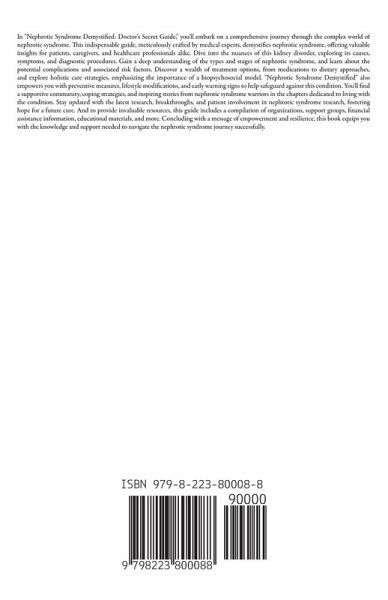 In "Nephrotic Syndrome Demystified: Doctor's Secret Guide," you'll embark on a comprehensive journey through the complex world of nephrotic syndrome. This indispensable guide, meticulously crafted by medical experts, demystifies nephrotic syndrome, offering valuable insights for patients, caregivers, and healthcare professionals alike. Dive into the nuances of this kidney disorder, exploring its causes, symptoms, and diagnostic procedures. Gain a deep understanding of the types and stages of nephrotic syndrome, and learn about the potential complications and associated risk factors. Discover a wealth of treatment options, from medications to dietary approaches, and explore holistic care strategies, emphasizing the importance of a biopsychosocial model. "Nephrotic Syndrome Demystified" also empowers you with preventive measures, lifestyle modifications, and early warning signs to help safeguard against this condition. You'll find a supportive community, coping strategies, and inspiring stories from nephrotic syndrome warriors in the chapters dedicated to living with the condition. Stay updated with the latest research, breakthroughs, and patient involvement in nephrotic syndrome research, fostering hope for a future cure. And to provide invaluable resources, this guide includes a compilation of organizations, support groups, financial assistance information, educational materials, and more. Concluding with a message of empowerment and resilience, this book equips you with the knowledge and support needed to navigate the nephrotic syndrome journey successfully.