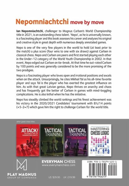 Ian Nepomniachtchi, challenger to Magnus Carlsen's World Championship title in 2021, is an outstanding chess talent. "Nepo" as he is universally known is a fascinating player and this book assesses his career and analyses his original and creative style in great depth with numerous deeply annotated games. Nepo is one of the very few players in the world to hold (at least prior to the match) a plus score (four wins to one with six draws) against Carlsen in classical chess. Nepo and Carlsen are peers and first started playing each other in the Under-12 category of the World Youth Championship in 2002. In that event, Nepo edged out Carlsen on tie-break. At that time he out-rated Carlsen by 100 points and was generally considered to be the more promising of the two prodigies. Nepo is a fascinating player who loves open and irrational positions and excels when on the attack. Unsurprisingly, he cites Mikhail Tal as his all-time favorite player and says Tal is the player who has exerted the greatest influence on him. As with that great Latvian genius, Nepo thrives on anarchy and chaos and has frequently got the better of Carlsen in games with mind-boggling complications. He is also lethal when he has the initiative. Nepo has steadily climbed the world rankings and his finest achievement was his victory in the 2020/2021 Candidates' tournament with 8¿/14 points (+5-2=7) which gave him the right to challenge Carlsen for the world title. Cyrus Lakdawala is an International Master, a former National Open and American Open Champion, and a six-time State Champion. He has been teaching chess for over 40 years, and coaches some of the top junior players in the U.S.