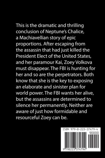 This is the dramatic and thrilling conclusion of Neptune's Chalice, a Machiavellian story of epic proportions. After escaping from the assassin that just killed the president-elect of the United States, and her paramour Kai, Zoey Volkova must disappear. The FBI is hunting for her and so are the perpetrators. Both know that she is the key to exposing an elaborate and sinister plan for world power. The FBI wants her alive, but the assassins are determined to silence her permanently. Neither is aware of just how formidable and resourceful Zoey can be.