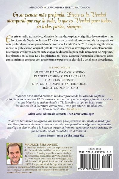 ASTROLOGIA En este estudio exhaustivo, Maurice Fernandez explora el significado evolutivo y las lecciones de Neptuno, la casa 12 y Piscis y corre el velo sobre uno de los arquetipos más profundos e incomprendidos del zodíaco. La edición de 2018 amplía significativamente la publicación original (2004), tras una extensa investigación complementaria. El enfoque evolutivo abarca siete etapas de desarrollo para cada ubicación de Neptuno, los planetas en la casa 12 y los planetas en Piscis. Maurice Fernandez comparte estos conocimientos estelares con una enorme experiencia, claridad y detalle sin precedentes. El libro incluye Neptuno en cada casa y signo Planetas y signos en la casa 12 Planetas en Piscis Neptuno en aspecto al eje nodal Tránsitos de Neptuno