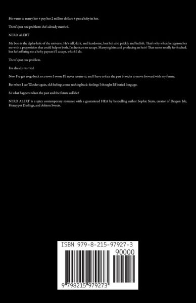 He wants to marry her + pay her 2 million dollars + put a baby in her. There's just one problem: she's already married. NERD ALERT My boss is the alpha-hole of the universe. He's tall, dark, and handsome, but he's also prickly and bullish. That's why when he approaches me with a proposition that could help us both, I'm hesitant to accept. Marrying him and producing an heir? That seems totally far-fetched, but he's offering me a hefty payout if I accept, which I do. There's just one problem. I'm already married. Now I've got to go back to a town I swore I'd never return to, and I have to face the past in order to move forward with my future. But when I see Wander again, old feelings come rushing back: feelings I thought I'd buried long ago. So what happens when the past and the future collide? NERD ALERT is a spicy contemporary romance with a guaranteed HEA by bestselling author Sophie Stern, creator of Dragon Isle, Honeypot Darlings, and Ashton Sweets.