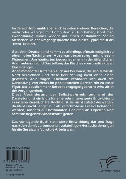 Dieses Buch stellt eine Rundreise durch Vergangenheit, Gegenwart und Zukunft des öffentlichen Nerd-Bildes dar. Dabei erfolgt keine Beschränkung auf die theoretische Erörterung, sondern es gibt zudem einen Praxisteil mit Strategien für den Umgang mit Nerds.