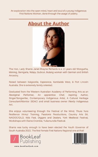""The Hon, Lady Shania Janet-Shayne Richards is a 22 years old Wongutha, Mirning, Barngarla, Ndaju, Gubrun, Bulang woman with German and British Ancestry. Raised between Kalgoorlie, Esperance, Kambalda West, & Port Lincoln Australia. She is extremely family oriented. Graduated from the Western Australian Academy of Performing Arts as an Aboriginal Performer, An apprentice Chef, Aspiring Author, Singer/Songwriter, Contemporary Indigenous Artist, A Cultural Heritage Consultant/Monitor (BDAC) and small business owner (Nerdy Indigenous Art). She enjoys volunteering through the Festival of the Wind, Thura Yura Resilience (Army) Training, Passionis Peoductions, Country Arts SA, NAIDOC/GILD, Kids Fest, Diggers and Dealers, York Medieval Festival, Workshops with Elaine Crombie, Yullamundie Festival. Shania was lucky enough to have been elected the Youth Governor of South Australia 2022. The first Female First Nations Regional one at that!""
