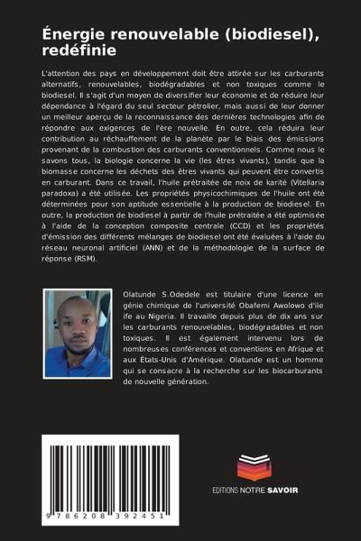 L'attention des pays en développement doit être attirée sur les carburants alternatifs, renouvelables, biodégradables et non toxiques comme le biodiesel. Il s'agit d'un moyen de diversifier leur économie et de réduire leur dépendance à l'égard du seul secteur pétrolier, mais aussi de leur donner un meilleur aperçu de la reconnaissance des dernières technologies afin de répondre aux exigences de l'ère nouvelle. En outre, cela réduira leur contribution au réchauffement de la planète par le biais des émissions provenant de la combustion des carburants conventionnels. Comme nous le savons tous, la biologie concerne la vie (les êtres vivants), tandis que la biomasse concerne les déchets des êtres vivants qui peuvent être convertis en carburant. Dans ce travail, l'huile prétraitée de noix de karité (Vitellaria paradoxa) a été utilisée. Les propriétés physicochimiques de l'huile ont été déterminées pour son aptitude essentielle à la production de biodiesel. En outre, la production de biodiesel à partir de l'huile prétraitée a été optimisée à l'aide de la conception composite centrale (CCD) et les propriétés d'émission des différents mélanges de biodiesel ont été évaluées à l'aide du réseau neuronal artificiel (ANN) et de la méthodologie de la surface de réponse (RSM).