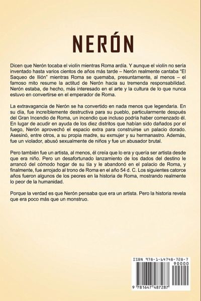 Si quiere descubrir la fascinante vida de Nerón, continúe leyendo... La extravagancia de Nerón se ha convertido en nada menos que legendaria. En su día, fue increíblemente destructiva para su pueblo, particularmente después del Gran Incendio de Roma, un incendio que incluso podría haber comenzado él. En lugar de acudir en ayuda de los diez distritos que habían sido dañados por el fuego, Nerón aprovechó el espacio extra para construirse un palacio dorado. Asesinó, entre otros, a su propia madre, su exmujer y su hermanastro. Además, fue un violador, abusó sexualmente de niños y fue un abusador brutal. Pero también fue un artista, al menos, él creía que lo era y quería ser artista desde que era niño. Pero un desafortunado lanzamiento de los dados del destino le arrancó del cómodo hogar de su tía y le abandonó en el palacio de Roma, y finalmente, fue arrojado al trono de Roma en el año 54 d. C. Los siguientes catorce años fueron algunos de los peores en la historia de Roma, mostrando realmente lo peor de la humanidad. Porque la verdad es que Nerón pensaba que era un artista. Pero la historia revela que era poco más que un monstruo. En Nerón: Una fascinante guía del último emperador de la dinastía julio-claudia y cómo gobernó el Imperio romano, descubrirá temas como:Los primeros emperadores Exilio Agripina mueve los hilos Matricidio Fuera de control Roma en llamas Arrepentimiento El último asesinato Y mucho, mucho más! Consiga ahora este libro para descubrir más sobre Nerón!