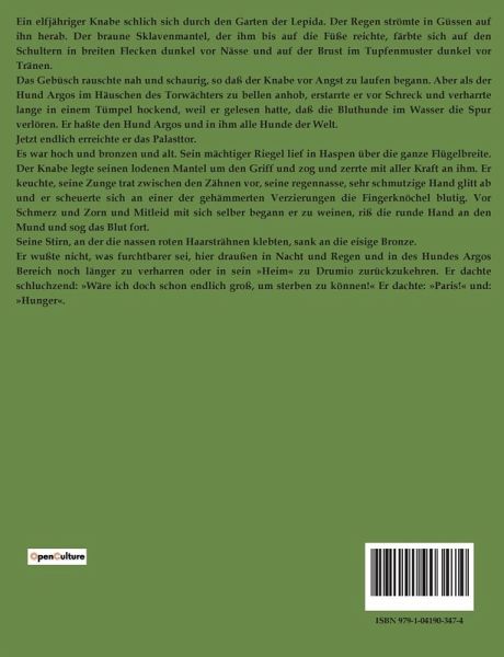 Ein elfjähriger Knabe schlich sich durch den Garten der Lepida. Der Regen strömte in Güssen auf ihn herab. Der braune Sklavenmantel, der ihm bis auf die Füße reichte, färbte sich auf den Schultern in breiten Flecken dunkel vor Nässe und auf der Brust im Tupfenmuster dunkel vor Tränen. Das Gebüsch rauschte nah und schaurig, so daß der Knabe vor Angst zu laufen begann. Aber als der Hund Argos im Häuschen des Torwächters zu bellen anhob, erstarrte er vor Schreck und verharrte lange in einem Tümpel hockend, weil er gelesen hatte, daß die Bluthunde im Wasser die Spur verlören. Er haßte den Hund Argos und in ihm alle Hunde der Welt. Jetzt endlich erreichte er das Palasttor. Es war hoch und bronzen und alt. Sein mächtiger Riegel lief in Haspen über die ganze Flügelbreite. Der Knabe legte seinen lodenen Mantel um den Griff und zog und zerrte mit aller Kraft an ihm. Er keuchte, seine Zunge trat zwischen den Zähnen vor, seine regennasse, sehr schmutzige Hand glitt ab und er scheuerte sich an einer der gehämmerten Verzierungen die Fingerknöchel blutig. Vor Schmerz und Zorn und Mitleid mit sich selber begann er zu weinen, riß die runde Hand an den Mund und sog das Blut fort. Seine Stirn, an der die nassen roten Haarsträhnen klebten, sank an die eisige Bronze. Er wußte nicht, was furchtbarer sei, hier draußen in Nacht und Regen und in des Hundes Argos Bereich noch länger zu verharren oder in sein »Heim« zu Drumio zurückzukehren. Er dachte schluchzend: »Wäre ich doch schon endlich groß, um sterben zu können!« Er dachte: »Paris!« und: »Hunger«.