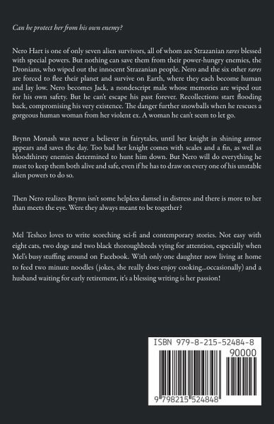 Can he protect her from his own enemy? Nero Hart is one of only seven alien survivors, all of whom are Strazanian rares blessed with special powers. But nothing can save them from their power-hungry enemies, the Dronians, who wiped out the innocent Strazanian people. Nero and the six other rares are forced to flee their planet and survive on Earth, where they each become human and lay low. Nero becomes Jack, a nondescript male whose memories are wiped out for his own safety. But he can't escape his past forever. Recollections start flooding back, compromising his very existence. The danger further snowballs when he rescues a gorgeous human woman from her violent ex. A woman he can't seem to let go. Brynn Monash was never a believer in fairytales, until her knight in shining armor appears and saves the day. Too bad her knight comes with scales and a fin, as well as bloodthirsty enemies determined to hunt him down. But Nero will do everything he must to keep them both alive and safe, even if he has to draw on every one of his unstable alien powers to do so. Then Nero realizes Brynn isn't some helpless damsel in distress and there is more to her than meets the eye. Were they always meant to be together?