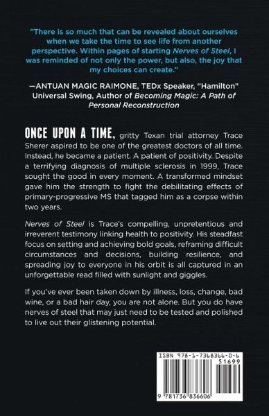 Once upon a time, gritty Texan trial attorney Trace Sherer aspired to be one of the greatest doctors of all time. Instead, he became a patient. A patient of positivity. Despite a terrifying diagnosis of multiple sclerosis in 1999, Trace sought the good in every moment. A transformed mindset gave him the strength to fight the debilitating effects of primary-progressive MS that tagged him as a corpse within two years. Nerves of Steel is Trace's compelling, unpretentious and irreverent testimony linking health to positivity. His steadfast focus on setting and achieving bold goals, reframing difficult circumstances and decisions, building resilience, and spreading joy to everyone in his orbit is all captured in an unforgettable read filled with sunlight and giggles. If you've ever been taken down by illness, loss, change, bad wine, or a bad hair day, you are not alone. But you do have nerves of steel that may just need to be tested and polished to live out their glistening potential. Trace J. Sherer is an attorney and mediator who has been living (and thriving) with MS for more than twenty years. Nerves of Steel is his debut as an author. He lives in Houston with two diva cats and one dog. Trace is working on his second book, a legal thriller. He loves to hear from readers. Contact him at trace@nervesofsteel.org. Candi S. Cross is the founder of You Talk I Write, a modern ghostwriting agency. She has co-developed approximately 140 books with authors worldwide. Candi is committed to helping diverse individuals with contemporary stories that make a difference. She lives in New York City with her wife and 24/7 muse, Liza. For more info, visit www.youtalkiwrite.com. "There is so much that can be revealed about ourselves when we take the time to see life from another perspective. Within pages of starting Nerves of Steel, I was reminded of not only the power, but also, the joy that my choices can create. Admittedly, I've been feeling overwhelmed by the choices available to me, which has led me to a sort of mental and emotional paralysis. I know that it's a paralysis of my own doing. Enter Trace Sherer, a stranger to me by all definitions of the word, to offer me a glimmer of light back to who I know myself to be. I firmly believe readers will find motivation in his story, not because of the successes he shares, but because of the challenges he made his way through to achieve them." --Antuan Magic Raimone, TEDx Speaker, Hamilton Universal Swing, Author of Becoming Magic: A Path of Personal Reconstruction "Trace's ability to use positivity in the hardest situations speaks to the power of mindset. In medical practice we often see the most positive patients thrive in the face of death, and his story is a testament to that! His story spreads hope and light and is worth the read for anyone dealing with an unexpected, life-altering challenge." --Danielle Don Diego, MD, Author of Self-Care RX "Following the murder of my daughter, I quickly learned about perspective and perseverance. Life is full of amazing people who show us every day that the perspective we put on our lives, combined with amazing perseverance, makes us capable of amazing things. For Trace, it has meant the difference between life and death. Trace teaches us all lessons about going forward from horrible news and determining our own outcomes. In spite of a death sentence due to illness back in 1999, he is able to write today that he is grateful to be alive. His choice to be positive is a lesson for us all as we go forward from our own moments in life." --Fred Guttenberg, Speaker and Author of Find the Helpers
