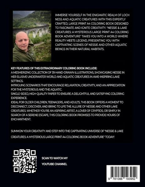 Step into the enigmatic world teeming with intrigue and allure in "Nessie & Lake Creatures: An Enigmatic Large Print A4 Coloring Book Adventure"! This extraordinary coloring book invites older kids, teens, and adults to explore and revel in the captivating charm of the elusive Nessie and diverse aquatic creatures. Key Features:39 meticulously crafted, large print A4 illustrations, showcasing the famed Nessie in its mystic Loch Ness and other creatures in their diverse aquatic habitats. Suitable for older kids, teens, and adults alike, providing endless hours of relaxation and creative expression. Printed on single-sided pages to prevent bleed-through and allow easy removal for display. High-quality paper, perfectly suited for coloring with colored pencils, markers, or crayons. From the enigmatic Nessie gracefully traversing the depths of Loch Ness to diverse creatures uncovering wonders beneath the water's surface, "Nessie & Lake Creatures: An Enigmatic Large Print A4 Coloring Book Adventure" presents a wide range of captivating scenarios that highlight the beauty and mystery of these enthralling creatures. This coloring book serves as a perfect gift for birthdays, holidays, or as a special surprise for any budding artist or cryptid enthusiast. Ignite their creativity, fuel their imagination, and let them dive into the thrilling realm of Nessie and lake creatures. Grab your copy of "Nessie & Lake Creatures: An Enigmatic Large Print A4 Coloring Book Adventure" today, and let the mysterious world of Nessie and lake dwellers come alive on every page!