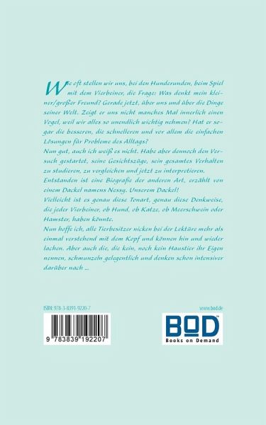 Wie oft stellen wir uns, bei den Hunderunden, beim Spiel mit dem Vierbeiner, die Frage: Was denkt mein kleiner/großer Freund? Gerade jetzt, über uns und über die Dinge seiner Welt. Zeigt er uns nicht manches Mal innerlich einen Vogel, weil wir alles so unendlich wichtig nehmen? Hat er sogar die besseren, die schnelleren und vor allem die einfachen Lösungen für Probleme des Alltags? Nun gut, auch ich weiß es nicht. Habe aber dennoch den Versuch gestartet, seine Gesichtszüge, sein gesamtes Verhalten zu studieren, zu vergleichen und jetzt zu interpretieren. Entstanden ist eine Biografie der anderen Art, erzählt von einem Dackel namens Nessy. Unserem Dackel! Vielleicht ist es genau diese Tonart, genau diese Denkweise, die jeder Vierbeiner, ob Hund, ob Katze, ob Meerschwein oder Hamster, haben könnte. Nun hoffe ich, alle Tierbesitzer nicken bei der Lektüre mehr als einmal verstehend mit dem Kopf und können hin und wieder lachen. Aber auch die, die kein, noch kein Haustier ihr Eigen nennen, schmunzeln gelegentlich und denken schon intensiver darüber nach ¿