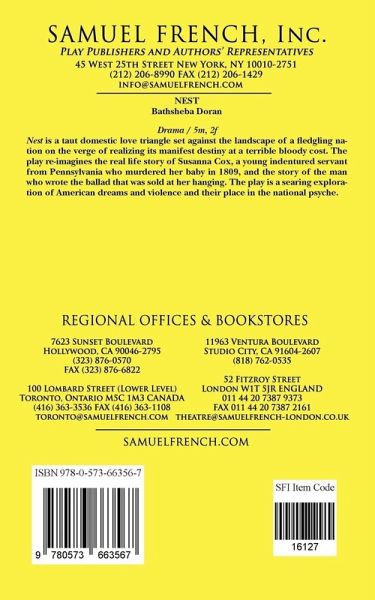 5m, 2f / Drama Based on historical fact, Nest is a taut domestic love triangle set against the landscape of a fledgling nation on the verge of realizing its manifest destiny at a terrible bloody cost. The play re-imagines the real life story of Susanna Cox, a young indentured servant from Pennsylvania who murdered her baby in 1809, and the story of the man who wrote the ballad that was sold at her hanging. The play is a searing exploration of American dreams and violence and their place in the national psyche. "[Susanna Cox's] tale is uniquely American, involving all our national obsessions: sexuality, class, gender roles, the search for national identity, and, most of all, the insidious, hypocritical piety coded into our cultural DNA...Doran is particularly deft at constructing dialogue filled with small, characterizing moments to elucidate her themes."-Washington City Paper "Bathsheba Doran has crafted this seemingly simple but gripping 90-minute work from the true story of Susanna Cox"- talkinbroadway.com "Nest...is no simple costume-drama rendering of [a] young woman's life and death....When the artificial walls of the earlier scenes fall away and the stage is flooded by the cast working as a kind of chorus, one feels the heart of the playwright."- MetroWeekly