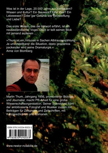 Der Traum, in die Zukunft zu sehen, ist so alt wie die Menschheit. Aber die Art, damit umzugehen, ändert sich.Alicia und Mark riskieren es: Sie nehmen an einem epochalen Experiment teil, dessen Ausgang ungewiss erscheint. Aber sie tun es nicht aus Neugier, sondern aus Verzweiflung. Beide haben nichts mehr zu verlieren.Erst im Laufe der Reise erwacht bei Alicia und Mark das Interesse an ihrem Ziel. Die wahren Hintergründe des Experiments erfahren sie, als an eine Rückkehr nicht mehr zu denken ist.Das erste Lebewesen, dem die beiden nach ihrer Ankunft begegnen, ist ein neuseeländischer Vogel. Doch der teilt seinen Blick mit jemand anderem ...