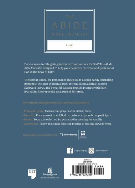 Do you yearn for life-giving, intimate communion with God? The Abide Bible Journals are designed to help you experience the peace, hope, and growth that come from encountering the voice and presence of God in Scripture. This journal volume of the Book of Luke will help you develop Scripture-engagement habits to help you know the power and spiritual nourishment of abiding in the Word. This Abide Bible Journal is designed to help you focus on the message of this section of the Bible. The format is ideal for personal or group study as each handy journaling paperback includes individual book introductions, a single-column Scripture layout, and powerful passage-specific prompts with light journaling lines opposite each page of Scripture. Created in partnership with Bible Gateway and the Taylor University Center for Scripture Engagement, the Abide Scripture engagement prompts are based on four ways of engaging deeply with the Bible: Praying Scripture: Pattern your prayers after biblical texts Picture It: Place yourself in a biblical narrative as a bystander or participant Journal: Focus and reflect on Scripture and its meaning for your life Contemplate: Follow the simple 4-step practice of feasting in God's Word Features include: Clear and readable Thomas Nelson NET Typeface Thick paper suited for journaling Brief book introductions Innovative Scripture-engagement prompts Handheld size for personal and group study Flexible sewn binding Stunning cover artwork by Stephen Crotts