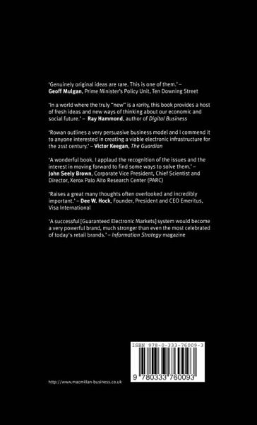 This book explores the possible creation and impact of electronic markets underpinned by government. How far could electronic trade go? The author outlines a world in which open online marketplaces are routinely used to trade everything from office space to bicycle rental between individuals. Each transaction would be guaranteed by the system, not the reputation of the seller. Anyone could enter the market as an equal. The author argues that the electronic marketplaces of the future will have widespread and fundamental economic and social consequences. For more information about Guaranteed Electronic Markets visit the Gems Website at www.gems.org.uk