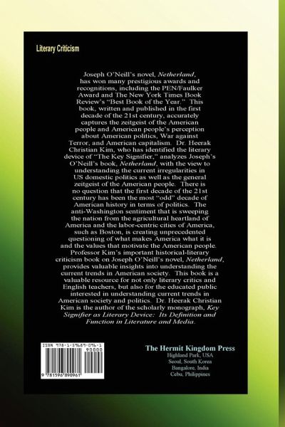 Joseph O'Neill's novel, Netherland, has won many prestigious awards and recognitions, including the PEN/Faulker Award and The New York Times Book Review's "Best Book of the Year." This book, written and published in the first decade of the 21st century, accurately captures the zeitgeist of the American people and American people's perception about American politics, War against Terror, and American capitalism. Dr. Heerak Christian Kim, who has identified the literary device of "The Key Signifier," analyzes Joseph's O'Neill's book, Netherland, with the view to understanding the current irregularities in US domestic politics as well as the general zeitgeist of the American people. There is no question that the first decade of the 21st century has been the most "odd" decade of American history in terms of politics. The anti-Washington sentiment that is sweeping the nation from the agricultural heartland of America and the labor-centric cities of America, such as Boston, is creating unprecedented questioning of what makes America what it is and the values that motivate the American people. Professor Kim's important historical-literary criticism book on Joseph O'Neill's novel, Netherland, provides valuable insights into understanding the current trends in American society. This book is a valuable resource for not only literary critics and English teachers, but also for the educated public interested in understanding current trends in American society and politics. Dr. Heerak Christian Kim is the author of the scholarly monograph, Key Signifier as Literary Device: Its Definition and Function in Literature and Media.