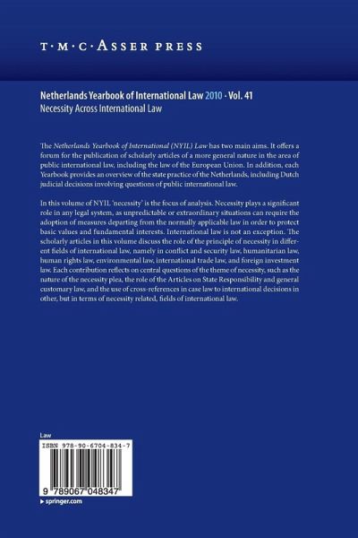 Part 1: Articles. Necessity Across International Law.- Necessity across international law - an introduction.- Necessity and the use of force: a special regime.- Necessity in the law of armed conflict and in international criminal law.- State responsibility, necessity and human rights.- A necessity paradigm of 'necessity' in international economic law.- Necessity in investment arbitration.- Necessity in international environmental law.- The notion of necessity in the law of the European Union.- Part 2: Documentation.- Classification Scheme.- Netherlands state practice for the parliamentary year 2008-2009.- Treaties and other international agreements to which the Kingdom of the Netherlands is a party - Conclusions and Developments 2009.- Netherlands municipal legislation involving questions of public international law, 2009.- Netherlands judicial decisions involving questions of public international law, 2008-2009.