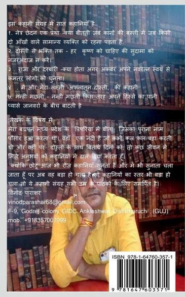 This story collection contains seven stories 1. Eye piercing is a practice - what happens when a normal person with two eyes has to live in the colony of the ears. 2. From friendship to devotion - every Krishna should not ignore his Sudama. 3. King and courtier - what would have happened if Akbar had chosen a lesser number than his Navratna self. 4. Me and my Lakshmi - great friendship, days spent in Pausar 5. Sahuji was a charming personality - there was only one shortcoming in Sahuji's life that we were his friends. 4. Pandit Manohar - The unique battle story of a Raj dancer and a Pandit 4. Little fish - How does a small fish distribute its share of water among thirsty animals