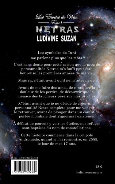 Les symboles de Tuni me parlent plus que les mots. C'est sans doute pour cette raison que la prog de personnalités Netras m'a suffi pour être heureuse les premières années de ma vie.Mais ça, c'était avant qu'il ne m'interviewe.Avant de me faire des amis, de connaître la douleur de les perdre, de découvrir que la menace des faucheurs pèse sur mes proches.C'était avant que je ne décide de créer une personnalité Netra complète pour me venger et le retrouver, avant de plonger dans un conflit de portée mondiale dont j'ignorais l'existence.À défaut de pouvoir y voir les étoiles, nos refuges sont baptisés du nom de constellations.Cette histoire commence dans la coupole d'Andromède, quand je l'ai rencontré, en 2555, le jour de mes 17 ans.